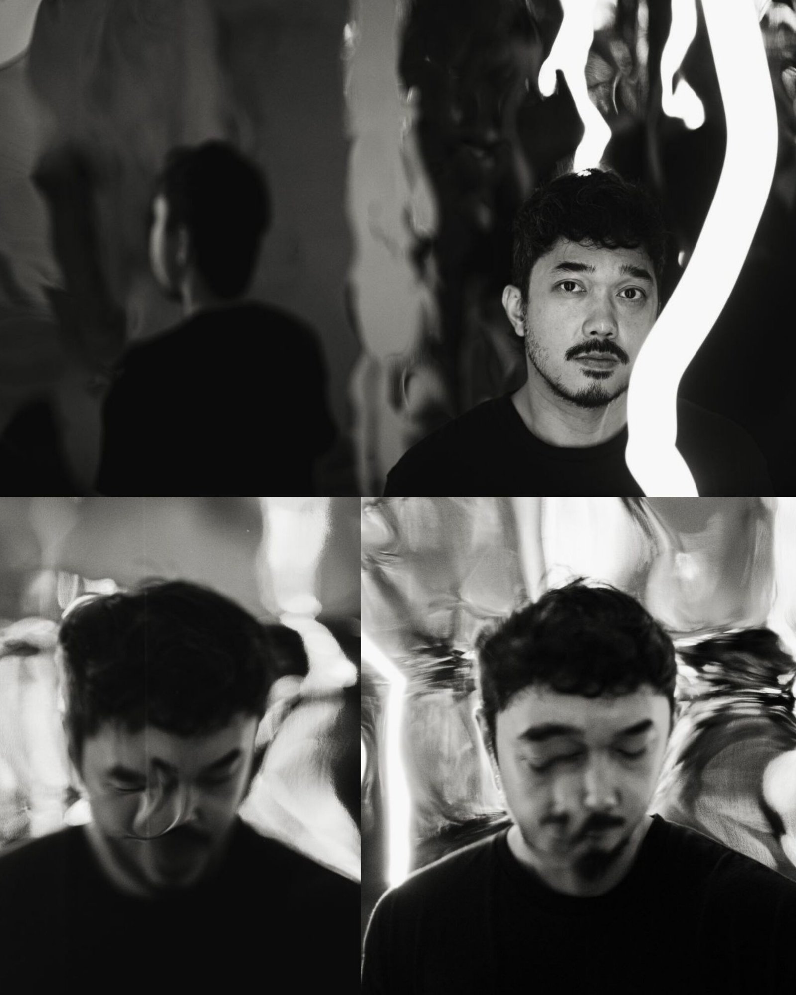 The elements in ‘Tremor’ respond to one another, presenting as themselves based on externalities. The resulting distortions of the sheets of stainless steel covering the walls are passed on from the distortions on the wall, illuminated by this crooked light’s emission with parts enshrouded by its shadows. Creating distortions upon distortions, the light and its shadows reverberate reflections with one another infinitely, constantly changing one’s perception of reality, never quite arriving at a single version of the truth.” —Carina Santos