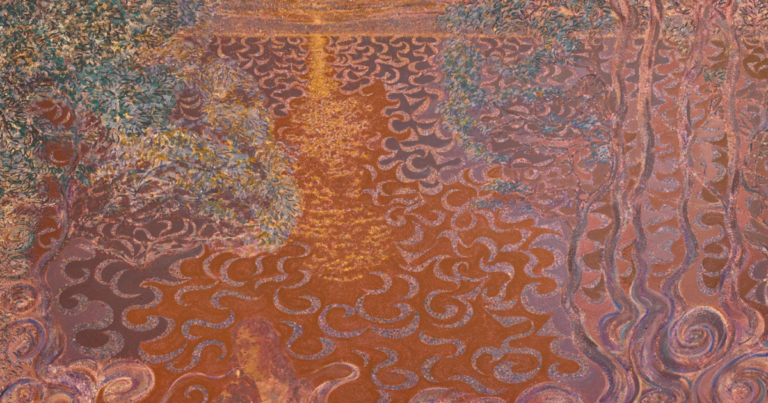 At Ronchini Gallery, the artist’s latest exhibition, “Mistaken Shores,” shows several hypnotic, fantastic landscapes, such as Hear, Said (2024), which depicts a psychedelic sunset over an ocean horizon rendered in luminous, swirling colors. This show transports the viewer into a starry world where the colors of natural or city scenes are illuminated and exaggerated, changing how we perceive these otherwise familiar landscapes. He often compares his paintings to language, an interpretation of the world around him. At Ronchini, building on this focus, Raz’s paintings are accompanied by a collection of poems written in response to the paintings in collaboration with poet Ben Ridley-Jones.