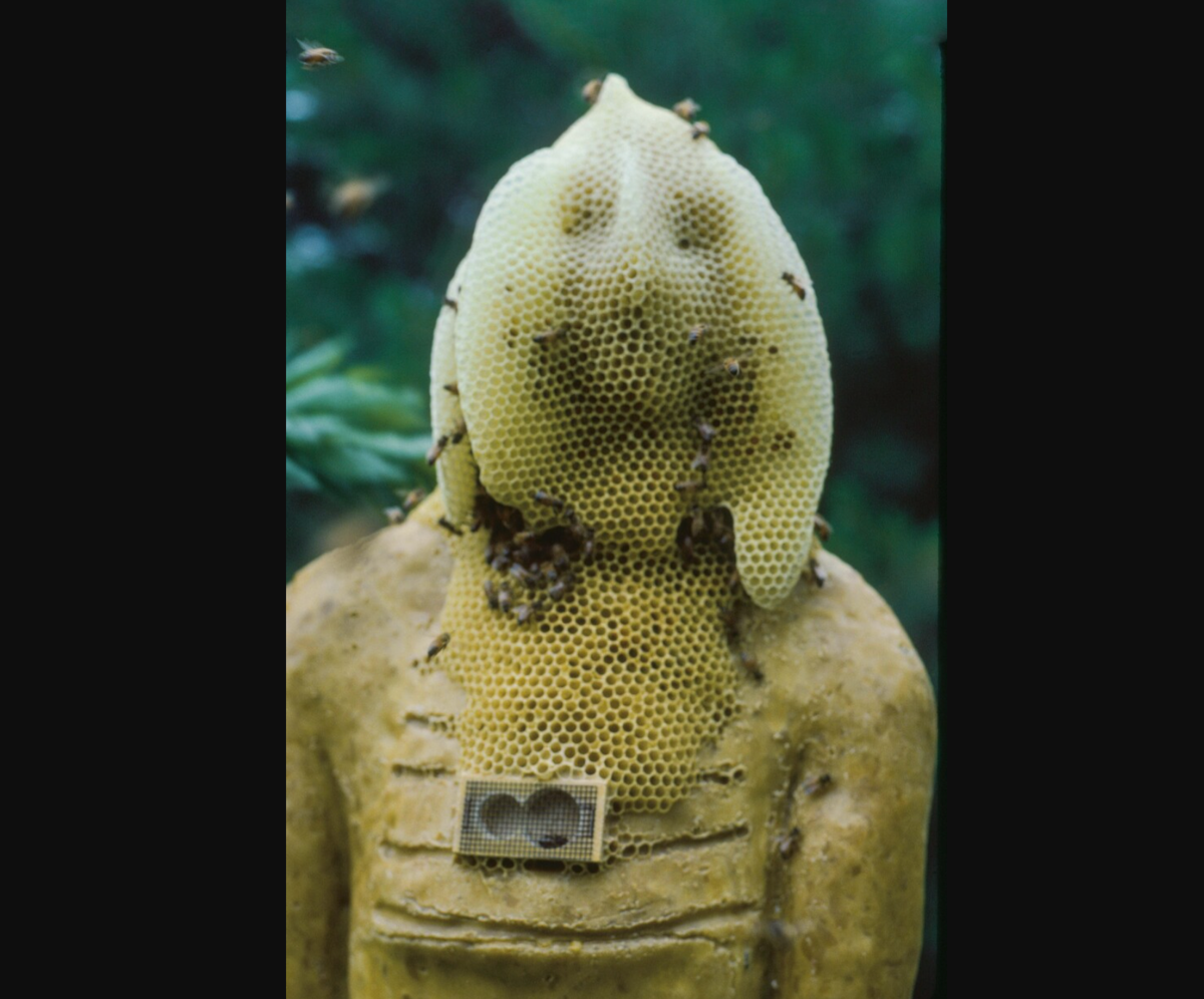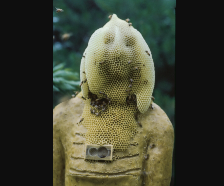 Garnett Puett, a sculptor and fourth-generation beekeeper, creates “Apisculptures” in collaboration with a bee colony. Puett has created a structure in which visitors may safely enter and witness the bees’ gradual creation of a sculpture.