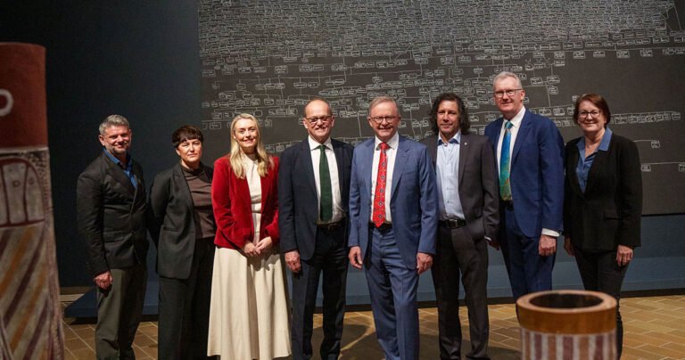 Nick Mitzevich (NGA), Ellie Buttrose, Jodie Haydon, Adrian Collette (CEO Creative Australia), The Hon. Anthony Albanese, Archie Moore, The Hon. Tony Burke and The Hon. Susan Templeman (Special Envoy for the Arts), standing in front of Family Tree by Archie Moore currently on display at the National Gallery of Australia