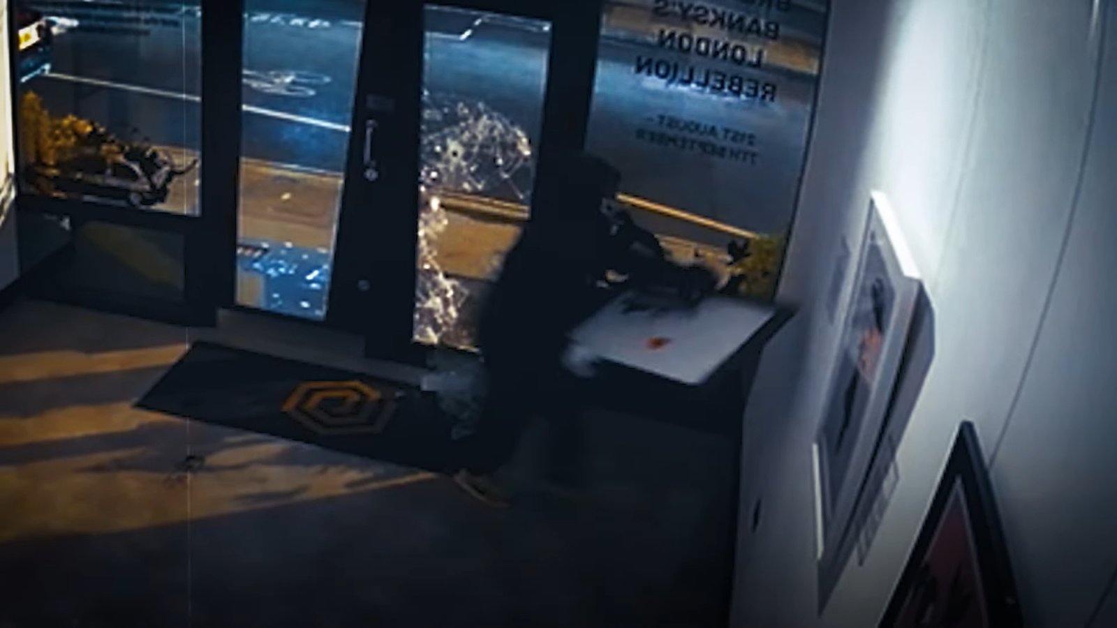 He then climbs through the shattered front door to enter the gallery.