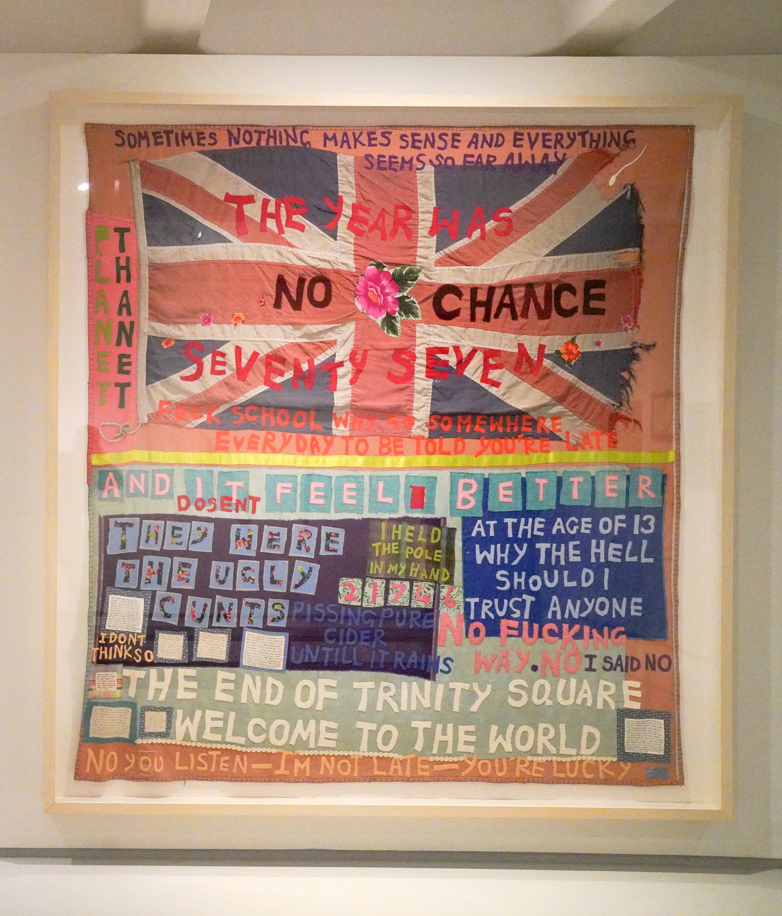 Occupying the center wall, Emin’s appliquéd blanket “No chance (WHAT A YEAR)” (1999), rages in all caps with spirited, diaristic proclamations, such as, “Sometimes nothing makes sense and everything seems so far away.” Emin made this piece to reflect the emotions she felt at age 13, the year a man raped her. Reading this in the wall text filled my gut with a sick feeling and haunted me. The vague recollection of a content warning on the Barbican’s website bubbled up from my memory.