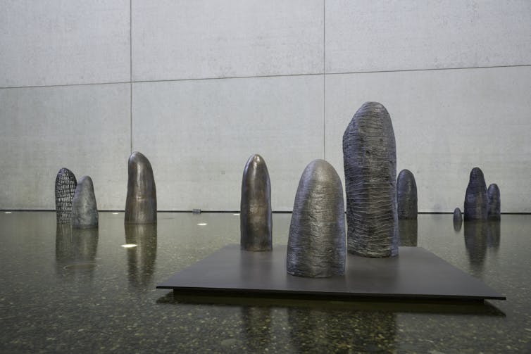Several sculptural works broaden Watson’s practice, with walama (2000) a large installation of bronze termite mounds and upside-down dillybags, and her wonderful toe row (2016), a cast bronze fishing net permanently installed outside the gallery.