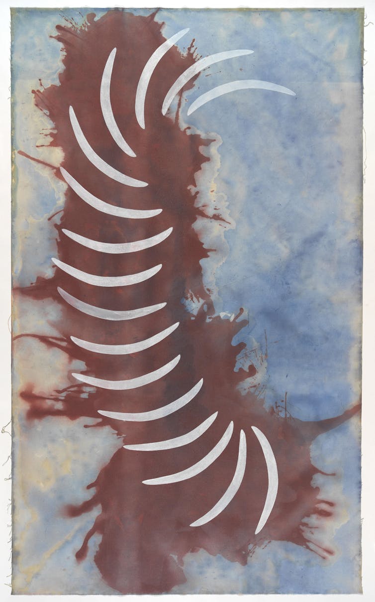 A more contemporary event, the demise of Palm Island man Cameron Mulrunji Doomadgee is also explored in memory bones (2007), a print work which Watson describes for her is “internal grieving” where white rib-like forms float above a blood-like splatter of red ochre.