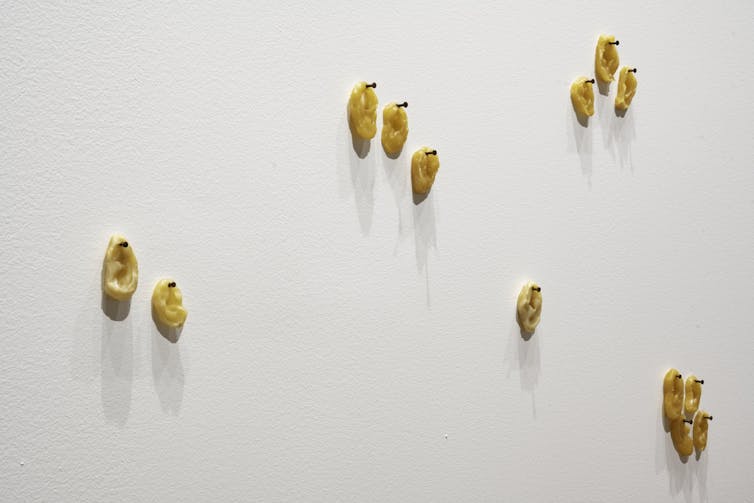 One such work is 40 pairs of blackfellow’s ears, lawn hill station (2008) which sees 40 pairs of cast beeswax ears nailed to the gallery wall, echoing the 19th century grisly punishment and murder of the Waanyi peoples by a brutal cattle station boss.