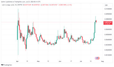 MEW is another Solana-based meme coin that has been drawing in a significant number of investors. The coin was recently the top gainer on Coinmarketcap, passing 200 other tokens. MEW recorded modest gains today, but it’s up an impressive 84.19% over the past week and 82.63% over the past month. Its year-to-date gains stand at 312%.